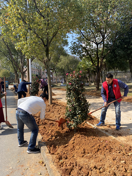 上午9点,医技楼西北侧环路边,后勤党员骑着三轮车、扛着锄头、背着铁锹,任务明确,分工清楚,呈现出一片热火朝天的景象。挖土、立苗、植树、填土、浇水,有条不紊地完成好每一道工序,流着的是汗水,洋溢的是笑脸。