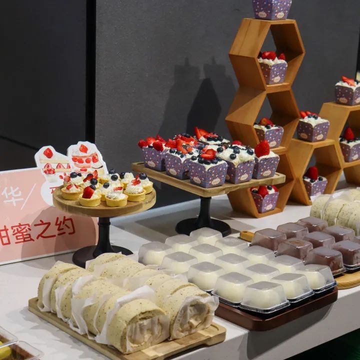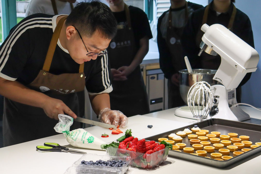 同学们在老师的带领下开始了自己的创作,多数同学是初学者,一开始动作略显生疏,形状怪异的麻薯,不听话的奶油,但是丝毫不影响大家的倾情投入,同学们尽情发挥,在大家的巧手下,一个个细腻软糯的绿豆糕、醇香滑顺的布丁、色彩缤纷的蛋糕等甜品“新鲜出炉”,摆满了料理台。