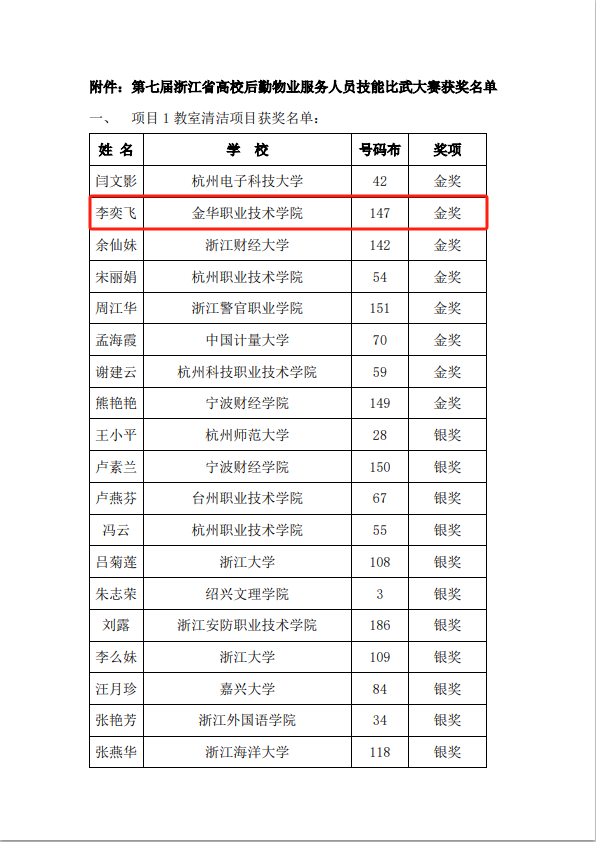 1月18-19日,第七届浙江省高校后勤物业服务人员技能比武大赛在衢州职业技术学院顺利举行。金职院后勤中心楼寓管理科李奕飞荣获本次大赛“教室保洁”项目金奖,刷新了金职后勤该项赛事历史最好成绩。