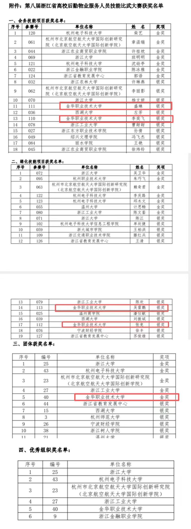 近日,第八届浙江省高校后勤物业服务人员技能比武大赛在绍兴隆重举行。此次技能比武共有46所高校130余名代表参赛。金华职业技术大学后勤处在多个项目中脱颖而出,荣获团体金奖和优秀组织奖,充分展现了学校后勤服务的高水平。